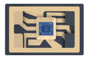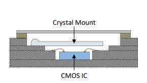 使用硅MEMS技術(shù)可以在同一芯片上制造定時陶瓷諧振器和溫度傳感器。使用傳統(tǒng)的石英晶體組裝工藝不可能同時振制造諧振器和溫度傳感器。石英TCXO的封裝,材料和性能限制需要晶體和溫度傳感器之間的大位移。石英傳感器需要對石英坯料進行細致的加工,拋光和修整,以在整個溫度范圍內(nèi)實現(xiàn)所需的頻率穩(wěn)定性,而CMOS IC上的振蕩器電路,溫度傳感器和補償電路使用傳統(tǒng)的硅微加工技術(shù)制造。將這兩個基于兩種不同材料系統(tǒng)的組件集成在一起會帶來許多挑戰(zhàn)。石英換能器通常使用導(dǎo)電粘合劑安裝在陶瓷封裝中,使得其用環(huán)境氮氣懸浮在封裝腔中。晶體通過鎢通孔和金線鍵合電連接到CMOS IC,CMOS IC安裝在封裝的底部。圖3a顯示了一體化石英晶體振蕩器陶瓷封裝的橫截面示意圖3b頂蓋上安裝有石英晶體的去蓋部分和3c與石英晶體相同的部分移除后,顯示CMOS IC,溫度傳感器,振蕩器和補償電路安裝在封裝底座上的晶體下方。