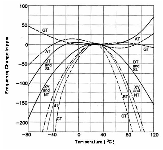 大部份的石英晶體產(chǎn)品是用于電子線路上的參考頻率基準或頻率控制組件, 所以, 頻率與工作環(huán)境溫度的特性是一個很重要的參數(shù). 事實上, 良好的頻率與溫度(frequeny versus temperature)特性也是選用石英做為頻率組件的主要因素之一. 經(jīng)由適當?shù)亩x及設(shè)計, 石英晶體組件可以很容易的就滿足到以百萬分之一 (parts per million, ppm) 單位等級的頻率誤差范圍. 若以離散電路方式將LCR零件組成高頻振蕩線路, 雖然也可以在小量生產(chǎn)規(guī)模達到所需要的參考頻率信號誤差在ppm或sub-ppm等級要求, 可是這種方式無法滿足產(chǎn)業(yè)要達到的量產(chǎn)規(guī)模. 石英組件的頻率對溫度特性更是離散振蕩線路無法簡易達成的. 在(圖四) 中提供了數(shù)種不同的石英晶振切割角度的頻率對溫度特性曲線.