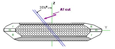 在各種不同種類的切割角度方式中, AT角度切割的石英芯片適用在數(shù)MHz到數(shù)佰MHz的頻率范圍,是石英芯片應(yīng)用范圍最廣范及使用數(shù)量最多的一種切割應(yīng)用方式. 在(如圖)中, 從"7M-12.000MAAJ-T"石英晶棒X-軸向的上視圖, 可以看到對Z-軸向旋轉(zhuǎn)約35度的AT 方向. 這在大量生產(chǎn)的技術(shù)上也是很好達成的一種作業(yè)方式.