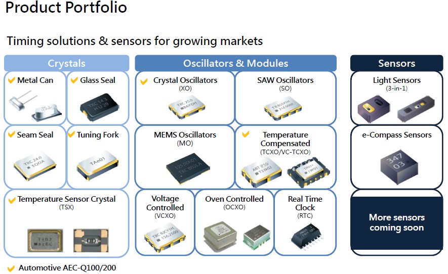 臺(tái)灣晶技為一專業(yè)之頻率組件與感測(cè)組件供貨商,自1983年成立以來(lái),始終致力于石英晶體相關(guān)諧振器(Crystal)、振蕩器(Oscillator) 等頻率組件之研發(fā)、設(shè)計(jì)、生產(chǎn)與銷售,并因應(yīng)市場(chǎng)應(yīng)用與需求.產(chǎn)品"9C-16.000MAAJ-T"被廣泛應(yīng)用到電子數(shù)碼產(chǎn)品,衛(wèi)星GPS導(dǎo)航,智能電腦,智能手機(jī)等產(chǎn)品.月產(chǎn)量8000萬(wàn)只,成為同行業(yè)中的佼佼者,產(chǎn)品遠(yuǎn)銷西歐一帶國(guó)家,巴西,中國(guó)香港,大陸,中國(guó)臺(tái)灣等全球市場(chǎng).