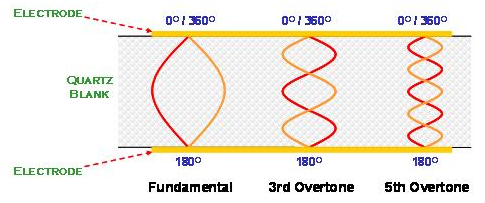 在AT切割角度的石英晶體共振子主要是以厚度剪切振蕩模態(tài)存在. 石英晶體在共振時, 除了基本波振蕩之外, 高階的倍頻共振也與基本波振蕩同時存在于石英晶體的電極區(qū)域之間. 但是, 由于壓電材料的電極是電氣相位相反的振動環(huán)境, 所以, 祇有奇數(shù)倍(odd number)的高頻倍頻可以發(fā)生, 偶數(shù)倍(even number)的倍頻共振在石英晶體共振子是不會存在的(圖十).