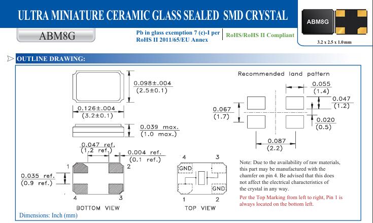 | ABM8G-12.000MHZ-4Y-T3 | Abracon LLC | ABM8G | MHz Crystal | 12MHz | 4-SMD, No Lead | 0.126" L x 0.098" W (3.20mm x 2.50mm) | 0.039" (1.00mm) |