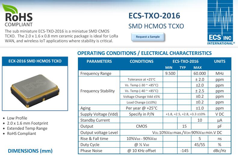 晶振之重,在于其為物聯(lián)網(wǎng)設(shè)備提供“心跳”般的精準時鐘信號.作為一款溫補晶振(TCXO),ECS-TXO-2016最亮眼的特質(zhì)便是-40~+85℃寬溫范圍內(nèi)2.5ppm的頻率穩(wěn)定度.這一精度意味著在極寒的極地探測或高溫的工業(yè)車間,設(shè)備時鐘誤差仍能控制在極低范圍.LoRaWAN等無線通信技術(shù)對時序同步要求嚴苛,正是這種穩(wěn)定性讓遠程數(shù)據(jù)傳輸精準無誤,避免了因時鐘偏差導(dǎo)致的信號失真或數(shù)據(jù)丟失,成為物聯(lián)網(wǎng)可靠運行的“定盤星”.