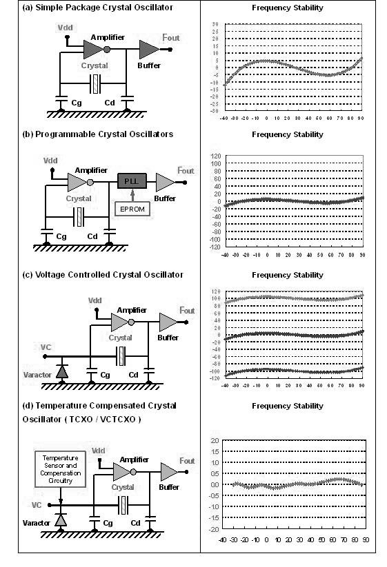 當(dāng)把石英共振子與振蕩線(xiàn)路或集成電路(IC)一起整合在一個(gè)封裝內(nèi), 由外部提供電源電壓, 形成一個(gè)主動(dòng)組件輸出頻率信號(hào), 就是所謂的"XYAAAAAANF-16.000000"石英晶體振蕩器. 石英晶體振蕩器可以藉由單一封裝組件內(nèi)部不同的振蕩線(xiàn)路及輸出線(xiàn)路, 提供不同特性需求的參考頻率(reference frequency). 例如有 石英頻率振蕩器SPXO ( Simple Package Crystal Oscillator ) 或稱(chēng)為 CXO ( Clock Crystal Oscillator ), 可程序化石英晶體振蕩器PCXO ( Programmable Crystal Oscillator ), 電壓控制石英晶體振蕩器VCXO ( Voltage Controlled Crystal Oscillator ), 溫度補(bǔ)償石英晶體振蕩器TCXO ( Temperature Compensated Crystal Oscillator ) 及 恒溫槽控制石英晶體振蕩器OCXO ( Oven Controlled Crystal Oscillator ).