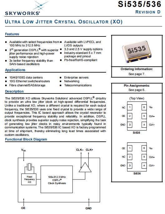 編碼536BB156M250DG,頻率為156.25MHz,Si535/536 XO時(shí)鐘振蕩器,OSC石英晶體振蕩器,采用Skyworks Solutions先進(jìn)的DSPLL®電路在高速差分頻率下提供超低抖動(dòng)時(shí)鐘。不像傳統(tǒng)的XO,每個(gè)輸出都需要不同的晶體頻率,Si535/536使用一個(gè)固定晶體提供廣泛的輸出頻率。這種基于集成電路的方法允許晶體諧振器提供卓越的頻率穩(wěn)定性和可靠性。此外,DSPLL時(shí)鐘合成提供了優(yōu)越的電源噪聲抑制,簡化了任務(wù)在嘈雜的環(huán)境中產(chǎn)生低抖動(dòng)時(shí)鐘的方法通信系統(tǒng)。基于Si535/536 IC的XO是工廠編程的在發(fā)貨時(shí),從而消除了較長的交貨時(shí)間定制的振蕩器。