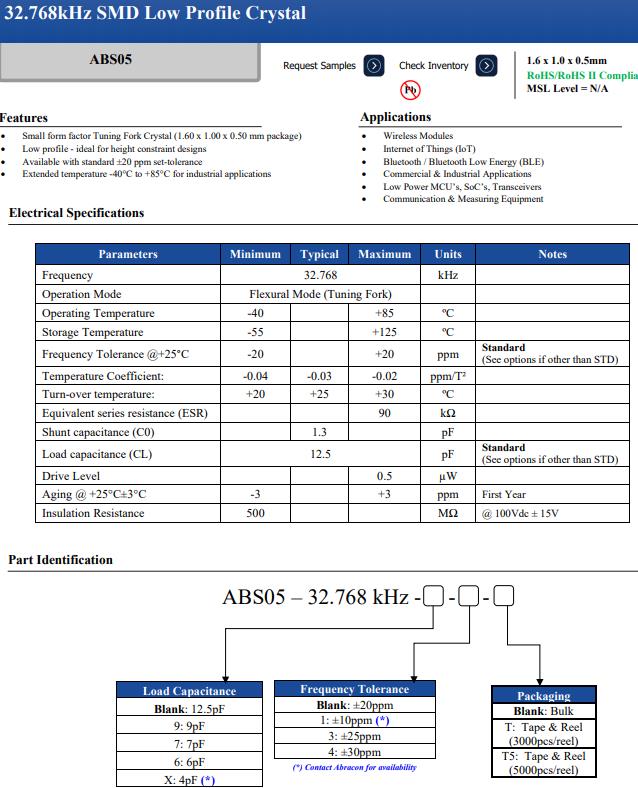 編碼ABS05-32.768KHZ-T,SMD晶振,小尺寸音叉晶體(1.60 x 1.00 x 0.50mm包裝),低輪廓-理想的高度限制設(shè)計,可提供標(biāo)準±20ppm設(shè)置公差,工業(yè)應(yīng)用擴展溫度-40°C至+85°C,應(yīng)用范圍:無線模塊,物聯(lián)網(wǎng),藍牙/藍牙低能量(BLE),商業(yè)和工業(yè)應(yīng)用,低功耗MCU, SoC,收發(fā)器,通信和測量設(shè)備