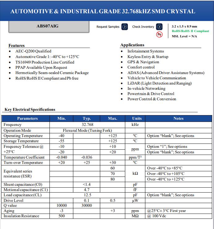 隨著行業(yè)的需求增長(zhǎng),艾博康公司推出編碼ABS07AIG-32.768KHZ-9-1-T無(wú)源晶振,符合AEC-Q200標(biāo)準(zhǔn) 汽車(chē)1級(jí):-40°C至+125°C TS16949生產(chǎn)線認(rèn)證 PPAP可應(yīng)要求提供 氣密接縫密封陶瓷封裝 符合RoHS/RoHS II標(biāo)準(zhǔn),無(wú)鉛.應(yīng)用程序 信息娛樂(lè)系統(tǒng) 無(wú)鑰匙進(jìn)入和啟動(dòng)GPS和導(dǎo)航,舒適控制 ADAS(高級(jí)駕駛輔助系統(tǒng)),車(chē)輛對(duì)車(chē)輛通信,激光雷達(dá)(光探測(cè)和測(cè)距) 車(chē)載網(wǎng)絡(luò),動(dòng)力系統(tǒng)和驅(qū)動(dòng)控制,電源控制和轉(zhuǎn)換.