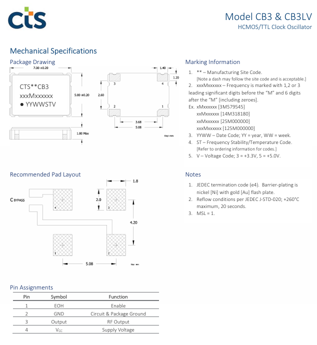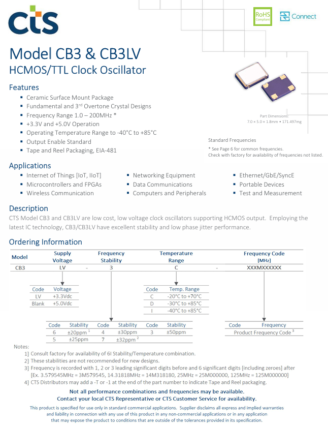 CB3LV-3I-50M000000美國CTS西迪斯 四腳7050 50M XO HCMOS TTL 3.3V 50PP -40+85