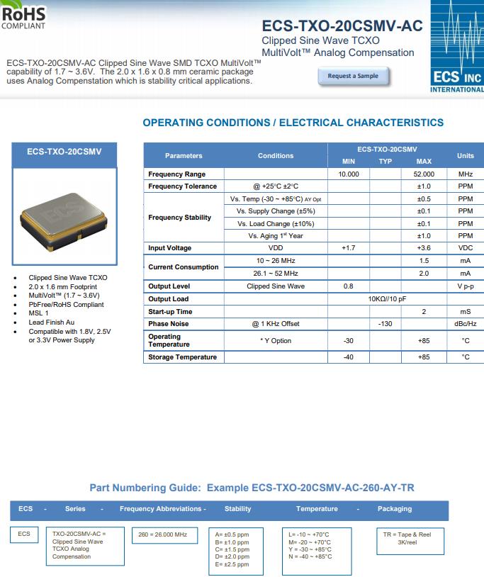 ECS晶振推出的溫度補(bǔ)償晶體振蕩器在1.7V至3.6V的多電壓能力和 1.8V、2.5V、3.0V 的靜態(tài)電源下,在-30°C至+85°C提供±0.5 ppm的超嚴(yán)密穩(wěn)定性選項(xiàng),和3.3V。ECS-TXO-20CSMV-AC使用高刷新率或頻率校準(zhǔn)率,在溫度補(bǔ)償期間保持線性頻率輸出。2.0 x 1.6 x 0.8 mm封裝使其適用于無(wú)線、Wi-Fi和物聯(lián)網(wǎng)應(yīng)用。削波正弦波溫補(bǔ)晶振為精密應(yīng)用提供超緊密的穩(wěn)定性ECS-TXO-20CSMV-AC-260-AY-TR