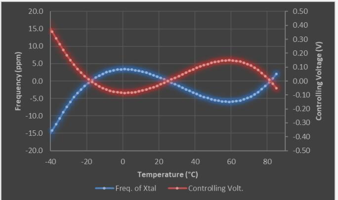 控制信號發(fā)生器是TCXO的心臟.第一步,它借助內(nèi)置溫度傳感器觀察環(huán)境溫度(ΔT)的變化.使用具有預(yù)定義參考電壓的比較器,感應(yīng)到的溫補晶振溫度(ΔT)將轉(zhuǎn)換為成比例的溫度電壓(V_T).下一步,使用多項式函數(shù)發(fā)生器將溫度電壓(V_T)轉(zhuǎn)換為特定的控制電壓(V_C.