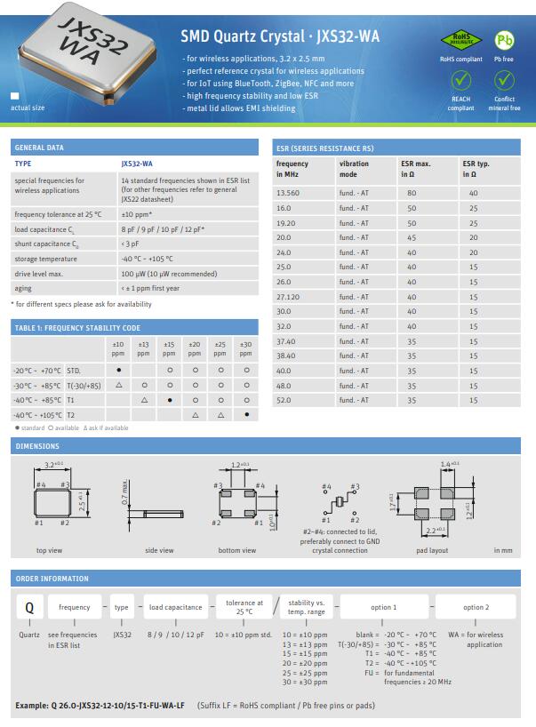 由于其高頻穩(wěn)定性和極低的ESR,這些特殊的JXS-WA晶體滿足了射頻收發(fā)器或物聯(lián)網(wǎng)應用所必需的高要求.