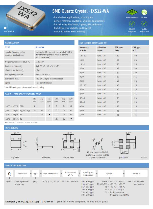 許多應用需要高頻精度.對于此類應用(LAN、Wi-Fi、藍牙等),嚴重的長期老化是不可接受的.因此,Jauch 進口晶振開發(fā)了專門針對此類應用進行了優(yōu)化的特殊石英晶體.除了許多其他改進外,這些WA(無線應用)晶體在生產過程中通過中間儲存在環(huán)境室中進行人工預老化,從而在10年內將老化大大減少到最大+/-7ppm.