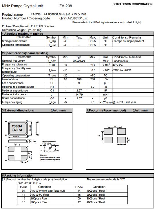 | Q22FA2380157016 | 3.2 x 2.5 x 0.7mm | FA-238晶振 | 24.000000 MHz | 15 pF | +/-50 ppm | +/-30 ppm | -20 to +70 °C | ≤ 60 Ω |