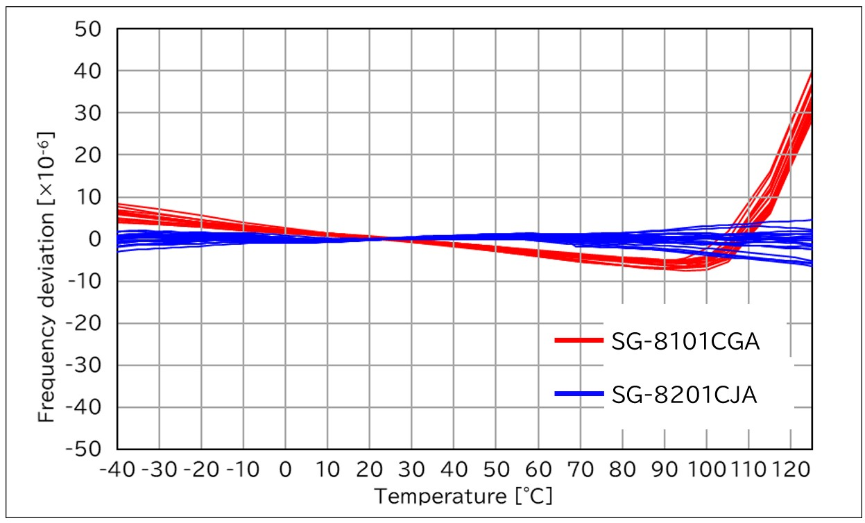 SG-8201CJA對(duì)汽車應(yīng)用的貢獻(xiàn)1通過溫度補(bǔ)償功能在寬溫度范圍內(nèi)實(shí)現(xiàn)高頻率穩(wěn)定性與現(xiàn)有的SPXO石英晶體振蕩器SG-8101CGA相比,該產(chǎn)品可將溫度變化調(diào)節(jié)至+125℃,在較寬的溫度范圍內(nèi)具有高穩(wěn)定性特性.SG-8201CJA即使在各種汽車應(yīng)用所需的惡劣溫度條件下(-40℃至+125℃)也能實(shí)現(xiàn)穩(wěn)定的頻率容差.■SG-8201CJA(±25x10-6/-40to+125℃)vsSG-8101CGA(±20x10-6/-40to+105℃).png)