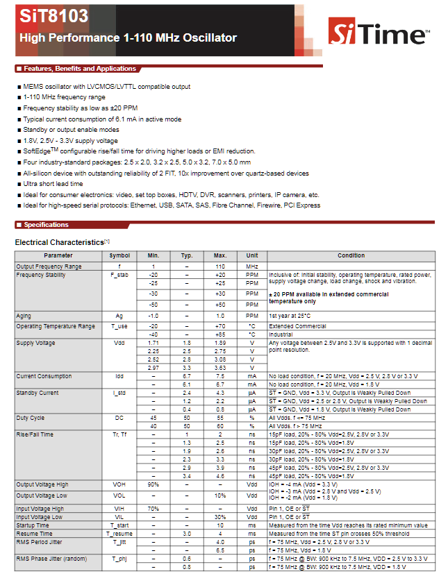 | SIT8103AI-23-33E-25.00000X | MEMS OSC XO 25.0000MHZ LVCMOS LV | 3.3V | ±50ppm | -40°C ~ 85°C | 4 | 3225 | SiTime | SiT8103 | LVCMOS,LVTTL |