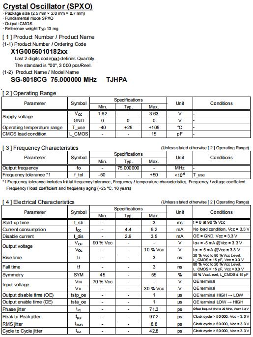 | X1G005601018300 | SG-8018CG | 75.000000 MHz | 2.50 x 2.00 x 0.80 mm | CMOS | 1.620 to 3.630 V | -40 to 105 °C | +/-50 ppm |