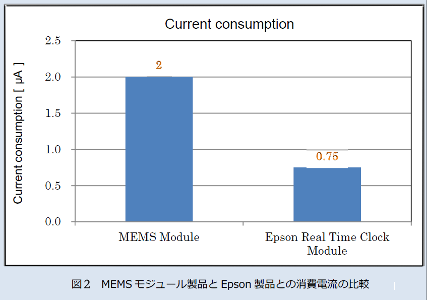 MEMS模塊產品,音叉石英晶體都是一樣的,難以實現低頻率,所以比較容易制造數百KHz成都的產品,用以時鐘的振蕩頻率和作為目的的頻率分周.圖二所示的是EPSON模塊產品和MEMS模塊的產品耗電說明.